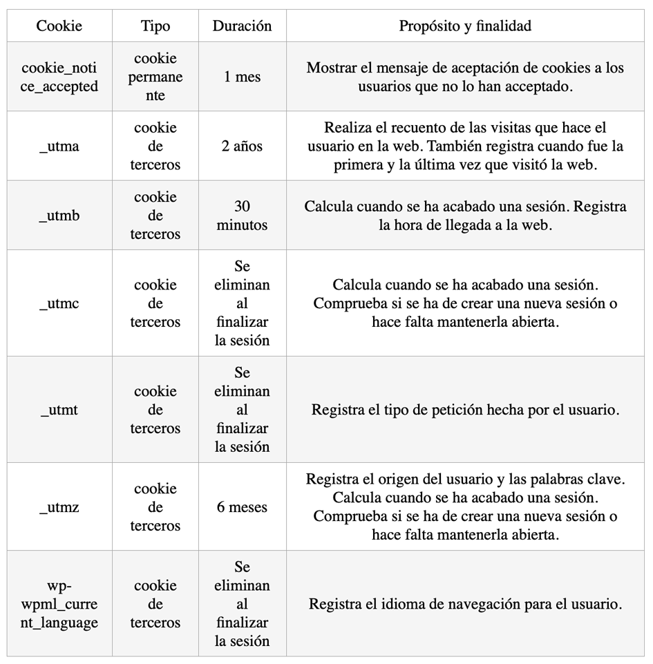 La siguiente tabla recopila de forma esquemática, las cookies que utilizamos en nuestro sitio web: